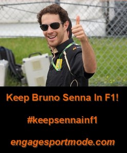 So, EngageSportMode would like to launch it’s Keep Bruno Senna in F1! campaign. Kamui Kobayashi has the backing of Taki Inoue, so I think it’s fair to give everyone’s favourite Brazilian driver some support too.